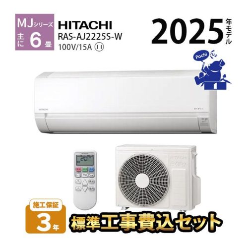 日立の「白くまくん」AJシリーズです。日立のエアコンの中でもシンプル機能でコストパフォーマンスに優れたモデルです。主に6畳のお部屋に適した単相100V・15A仕様の2025年モデルです。